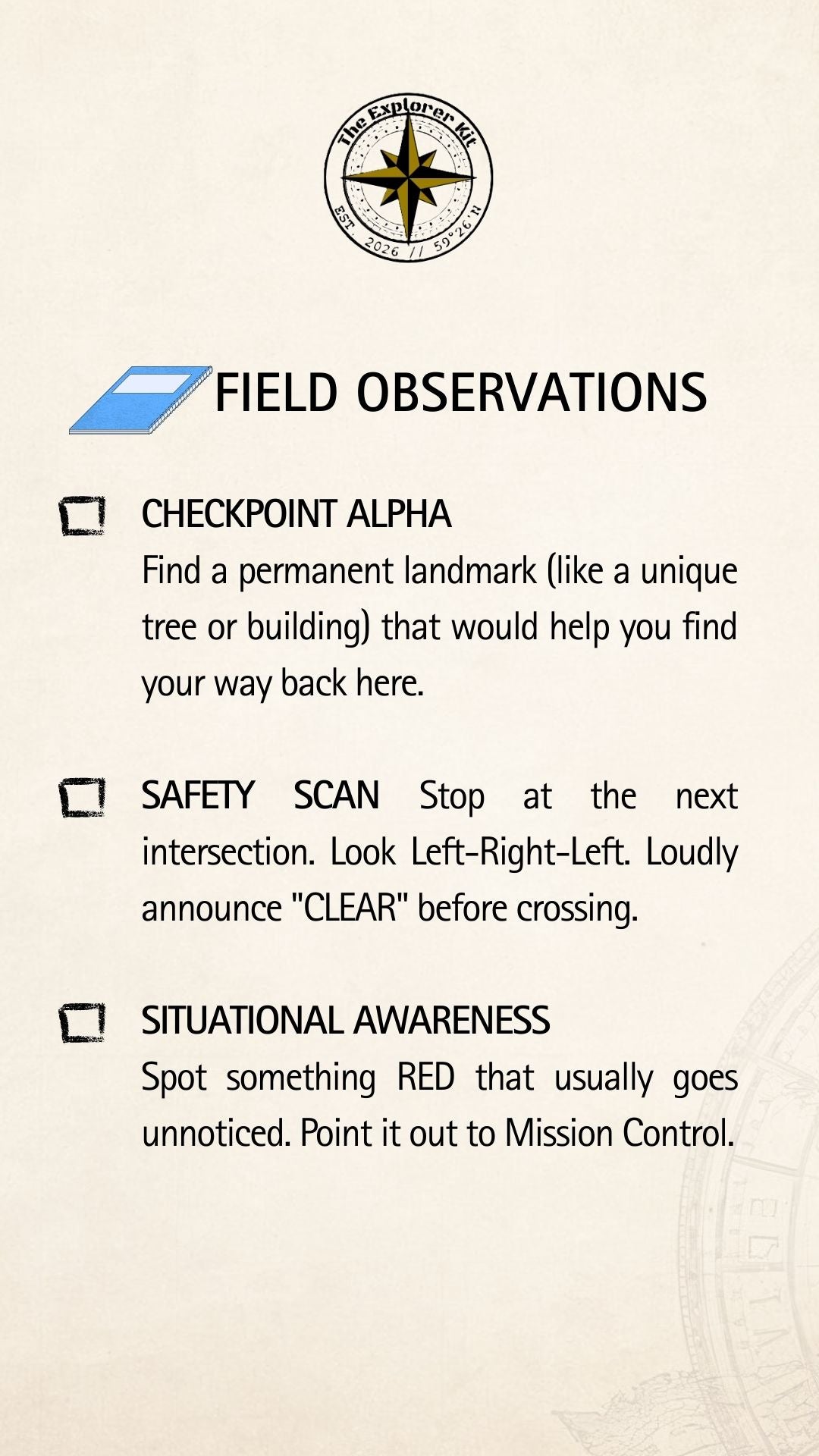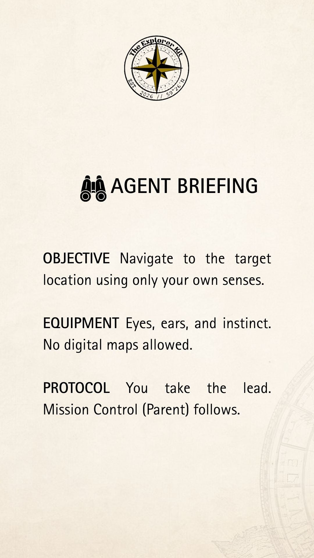 It’s not another worksheet. The Explorer Kit is a classified, real-world mission that turns an ordinary neighborhood walk into an agent - style training exercise.